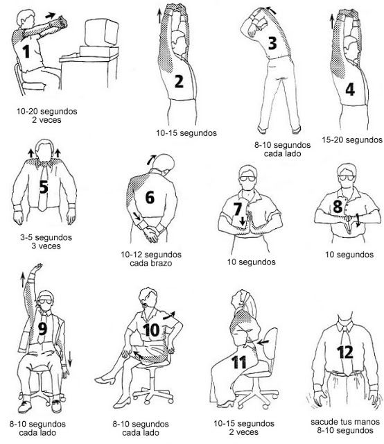 Qué es lo más recomendable, tomarte breves recesos de 3 a 5 min, ¿cómo? levantarse cada cierto tiempo 20 a 30 min aprox, puedes caminar primeramente, seguido de algún Estiramientos para columna, cadera, rodillas y cuello. Revisa la silla y escritorio, que están a la altura correspondiente, inclusive podrías ponerte de pie colocando la laptop sobre un mueble y quede a la altura de los ojos, trabajar una rato parado. Organiza y planifica tus horas de trabajo, si es un día de mucho movimiento divide en partes, con horas cortas de meriendas, estiramientos o entrenamientos.